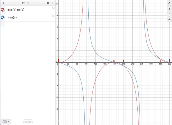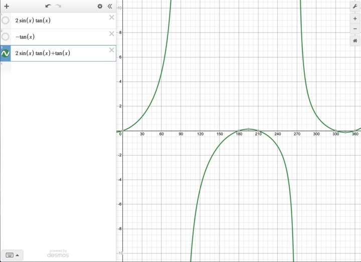 And note if you rearrange to 2sin(x)tan(x)+tan(x) = 0 and graph the LHS, you can simply look for where this rearranged function crosses the x-axis: