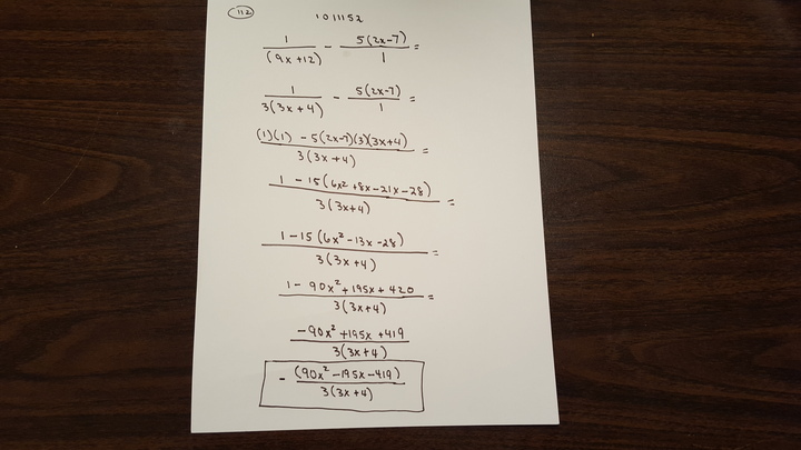 SOLUTION: Simplify 1/(9x+12) -5(2x -7)