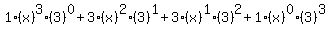 1%28x%29%5E3%283%29%5E0%2B%28x%29%5E2%283%29%5E1%2B3%28x%29%283%29%2B1%28x%29%283%29 Looking at the second term 3%28x%29%283%29 raise x to the 2nd power and raise 3 to the 1st power.