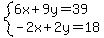 SOLUTION: hi... my equation is 6x+9y=39 and the bottom one is -2x+2y=18 i need to find the method of the equation i hope you can help me with this problem thank you a lot...