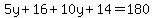 Supplementary angles sum up to 180 degrees (5y + 16) + (10y + 14) = 180. Solve for y. Then evaluate (5y+16) and (10y+14).