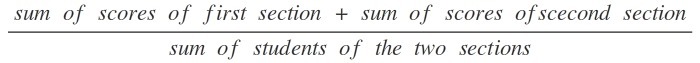 -> SOLUTION: The mean of the 20 students’ scores in my first section is 75. The mean of the 30 students’ scores in my second section is 85. What is the overall mean for both sections?