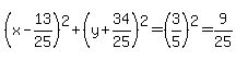 ANSWER #1: %28x-13%2F25%29%5E2%2B%28y%2B34%2F25%29%5E2+=+%283%2F5%29%5E2+=+9%2F25