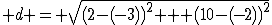 The distance from (2,10) to (-3,-2) is exactly 13 units.