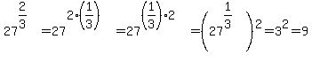 Since I think finding the cube root of 27 is easier than squaring 27. So I will find the cube root and then square it: