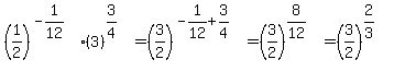 I cannot seem to work this out. I have tried with the algibrator program but it seems to take a million steps for what at first appears to be a not too complicated problem. I have tried to reduce the whole numbers to , for example 8 to 2^4 etc. I do not know if this will appear correctly in the text so I will describe the problem. 8 with the fractional indices 2 over 3 times 27 with the fractional indices 3 over 4 all over 16 with the fractional indices 3 over 4 times 9 with the fractional indices 3 over 4