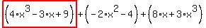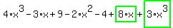 For tutors: simplify_cartoon( (4x^3-3x+9)+(-2x^2-4)+(8x+3x^3) )