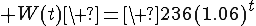Question 1121183: The projected worth (in millions of dollars) of a large company is modeled by the equation w = 236(1.06) t. The variable t represents the number of years since 2000. What is the projected annual percent of growth, and what should the company be worth in 2011? Answer by solver91311(24713) (Show Source):