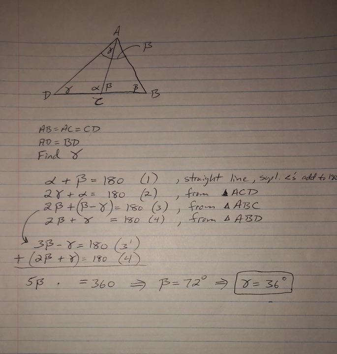 -> SOLUTION: In the figure, AB = AC = CD, and AD = BD. Find the measure of ∠ ADC in degrees.