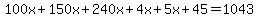 Question 126501: Malcome has $1043 in bills of the following denominations: hundreds,fifties,twenties,fives,and ones. He has three times as many fifties as hundreds,twelve times as many twenties as hundreds, and four times as many ones as hundreds. He has nine more fives than hundreds. How many of each denomination of bill does he have? Answer by marcsam823(57) (Show Source):
