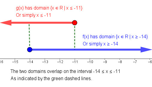 Therefore the domain of (g+f)(x) is which shows that x = -14 is the smallest input allowed for function (g+f)(x).