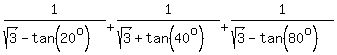 1/(sqrt(3)-tan (20°))+1/(sqrt(3)+tan(40°))+1/(sqrt(3)-tan(80°)) Found 2 solutions by AnlytcPhil, Alan3354:Answer by AnlytcPhil(1810) (Show Source):