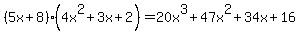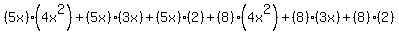 -> SOLUTION: Multiply {{{(5x+8)(4x^2+3x+2)}}}
