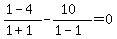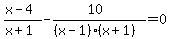 -> SOLUTION: Solve and check all proposed solutions. {{{(x-4)/(x+1)-10/(x^2-1)=0}}}