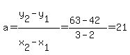 hahaWe are trying to find equation of form y=ax+b, where a is slope, and b is intercept, which passes through points (x1, y1) = (2, 42) and (x2, y2) = (3, 63).