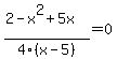 The next thing to realize is that if and only if and . So in order to solve this equation, we don't have to worry about the denominator (except to exclude 5 if it comes up as a solution) and all we have to do is set the numerator equal to zero and solve the quadratic.