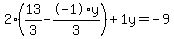 2%2A%2813%2F3+-+-1%2Ay%2F3%29+%2B+1%5Cy+=+-9 and simplify: So, we know that y=-10.6. Since x+=+13%2F3+-+-1%2Ay%2F3, x=0.8.