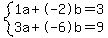 +system%28+%0D%0A++++1%5Ca+%2B+-2%5Cb+=+3%2C%0D%0A++++3%5Ca+%2B+-6%5Cb+=+9+%29%0D%0A++We'll use substitution. After moving -2*b to the right, we get: