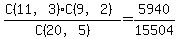 \item 3 white balls and 2 red balls: $\binom{11}{3} \binom{9}{2} = \frac{11 \times 10 \times 9}{3 \times 2 \times 1} \times \frac{9 \times 8}{2 \times 1} = 165 \times 36 = 5940$