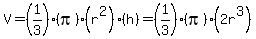 The volume of the cone is V=%281%2F3%29%28pi%29%28r%5E2%29%28h%29=%281%2F3%29%28pi%29%282r%5E3%29