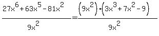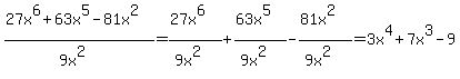 -> SOLUTION: Divide and check 27x^6+63x^5-81x^2 divided by 9x^2
