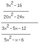 : 9x squared minus 16 over 20x squared minus 24x divided by 3x squared minus 5x minus 12 over 5x squared minus x minus 6 This question is from textbook introductory algebra