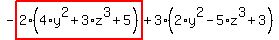 For tutors: simplify_cartoon( -2*(4y^2+3z^3+5)+3*(2y^2-5z^3+3) )