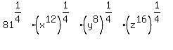 Take the one-forth power of 81%2Ax%5E12%2Ay%5E8%2Az%5E16