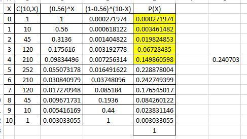 Question 1056055: The probability that a randomly selected teenager studied at least once during a week was only 0.56. What is the probability that less than half of the students in your study group of 10 have studied in the last week? (Round your answer to two decimal places.) Answer by Fombitz(32388) (Show Source):