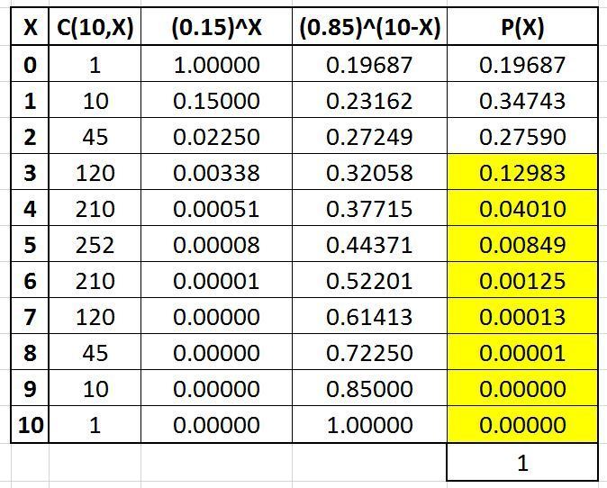 Question 1099140: A manufacturing company regularly conducts control checks at specified periods on the products it manufactures. historically the failure rate for led bulbs that the company manufactures is 15 %. suppose a random sample of 10 led bulbs is selected?