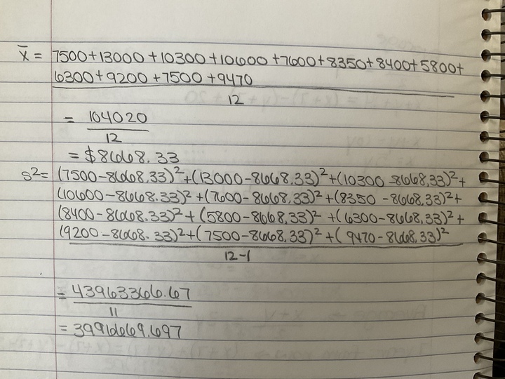 (a) sample mean = 8668.33; sample variance = 3996669.70