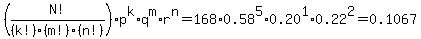 Notice that p + q + r = 1. Because these are the only possible outcomes, we can find the probability above using a formula similar to that for binomial distributions. In general, if we take a sample of N people, and we want to split them into three groups, one of size k, one of size m, and one of size n, the number of ways we can do this is: