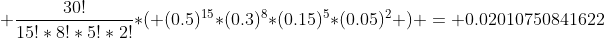 Question 877303: The probability that a person will make 0,1,2 or 3 errors on his or her income tax return is 0.50, 0.30, 0.15 and 0.05, respectively. IF 30 claims are selected, find the probability that 15 will contain 0 errors,8 will contain 1 error, 5 will contain 2 errors and 2 will contain 3 errors. Answer by jim_thompson5910(35256) (Show Source):