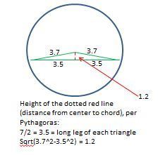 SOLUTION: A chord 7cm long is drawn in a circle of radius 3.7cn. Calculate the distance of the chord from the centre of the circle.