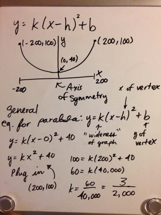 Question 927274: Can you help with: The main cables of a suspension bridge are ideally parabolic. The cables over a bridge that is 400 feet long are attached to towers that are 100 feet tall. The lowest point of the cable is 40 feet above the bridge.