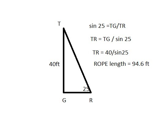 Question 1155021: A 40ft flag pole has a rope tied from to top to the ground. The rope makes a 25 degree angle