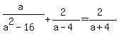 You can put this solution on YOUR website! Multiply each term by (a^2-16); (a^2-16)=(a+4)(a-4)