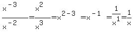 Question 460116: Rewrite with positive exponents. Assume that even roots are of nonnegative quantities and that all denominators are nonzero (x^-3/x^-2) Answer by jim_thompson5910(35256) (Show Source):