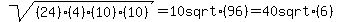 A(ABC) = sqrt%28%2824%29%284%29%2810%29%2810%29%29+=+10+sqrt%2896%29+=+40+sqrt%286%29