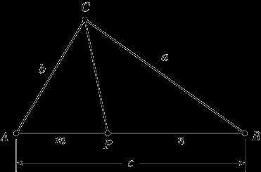 In the following illustration, a, b, c are the sides of the triangles, m, n is the length of the segments split by the cevian, and d (not labeled) is the length of the cevian.