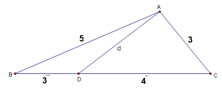 Let us begin with an example. Suppose we have a triangle with sides AC = 3, AB = 5, and BC = 7. The cevian splits side BC into segments of length 3 and 4. What is the length of the cevian?