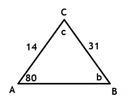 Angle A is 80 degrees. Side AC is 14 and side Bc is 31. What are measures of angles b and c, and the AB.