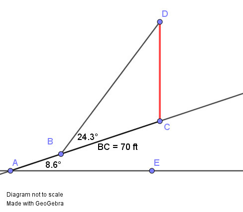 SOLUTION: A flagpole is perpendicular to the horizontal but is on a slope that rises 8.6° from the horizontal. The pole casts a 70-foot shadow down the slope and angle of elevation of the s