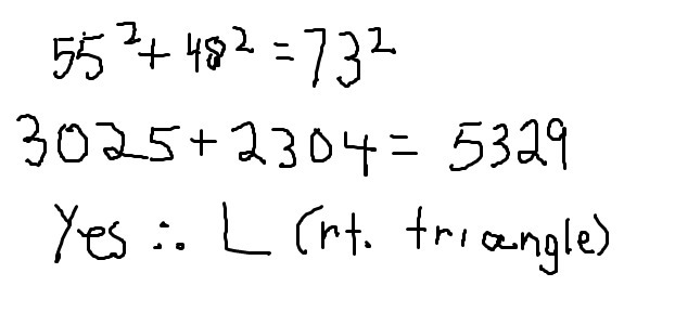 Question 855142: A triangle has three sides: a, b, and c. Side a = 55 meters, and side b = 48 meters, and side c = 73 meters. True or false: this triangle is a right triangle