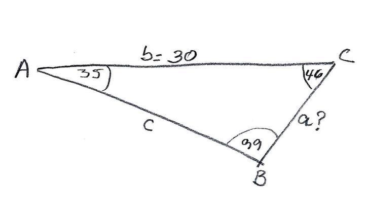 First we find the missing angle. The angles in every triangle, no exceptions, add up to 180. So, 180-(35+46)= 99 is our 3rd angle