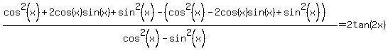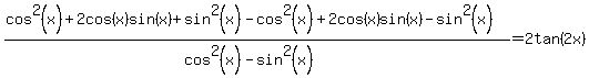 -> SOLUTION: Show the following identities. A). {{{cosx+sinx/cosx-sinx - cosx-sinx/cosx+sinx = 2tan2x}}} B). {{{cos^4theta - sin^4theta = cos 2theta}}} C). {{{ (cos(alpha+bet