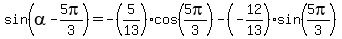 sin α = − 5/13, tan α > 0, sin (α − 5π/3)