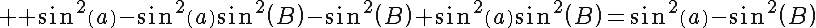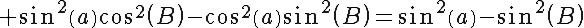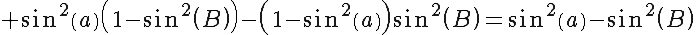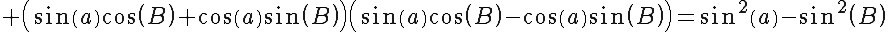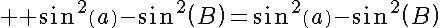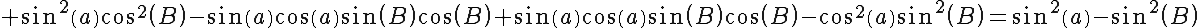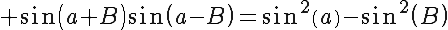 Question 138819: Prove the identity: sin%28a+%2B+B%29+sin+%28a-B%29+=+%28sin%28a%29%29%5E2-%28sin%28B%29%29%5E2 (x is theta)