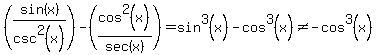 I'm presuming that you mean %28sin%28x%29%2Fcsc%5E2%28x%29%29-%28cos%5E2%28x%29%2Fsec%28x%29%29=-cos%5E3%28x%29 rather than %28sin%28x%29%2Fcsc%282x%29%29-%28cos%282x%29%2Fsec%28x%29%29=-cos%283x%29, because the second one is a horror I have no intention of spending the rest of the afternoon solving.