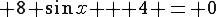 SOLUTION: Solve 8sin0(with a line through it)+4=0, where 0(with a line through it) is any real number of radians. I worked it out to 0(with a line through it)= 7pi/6+
